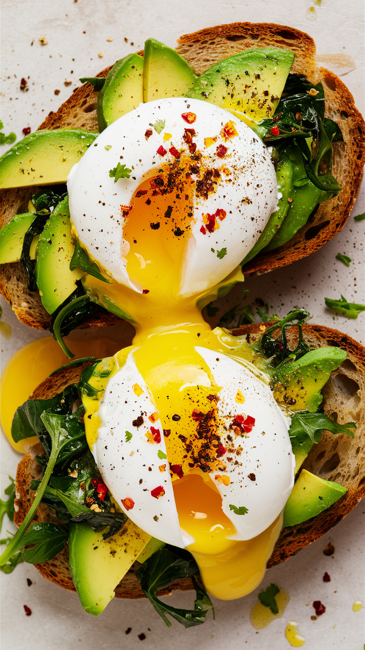 Unta el aguacate en las tostadas y coloca el huevo encima.