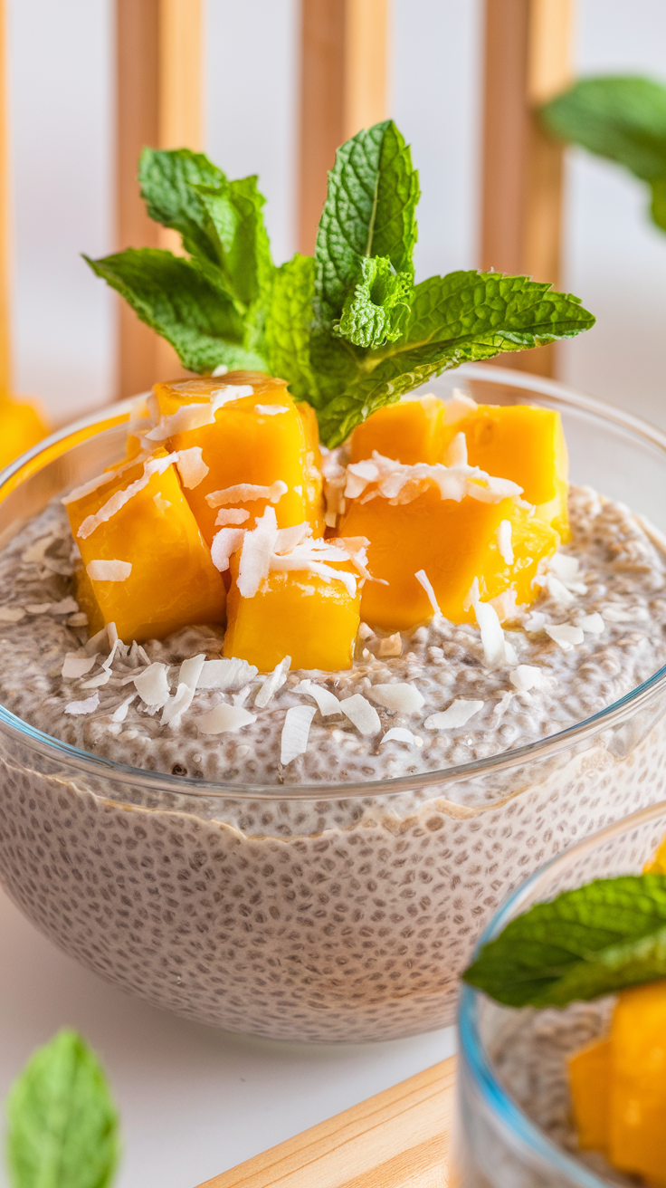 Cuando el pudding de chía esté listo, sírvelo en un bol y decora con los trozos de mango, el coco rallado y un toque de canela.