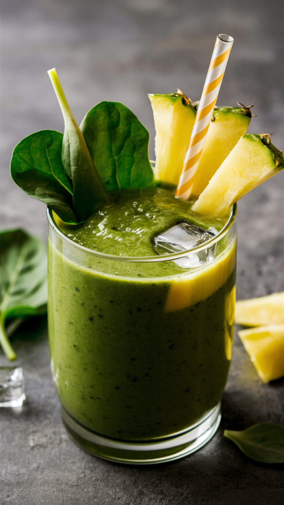 - Licúa espinacas, piña, plátano, yogur griego y leche de almendras hasta que quede suave.
