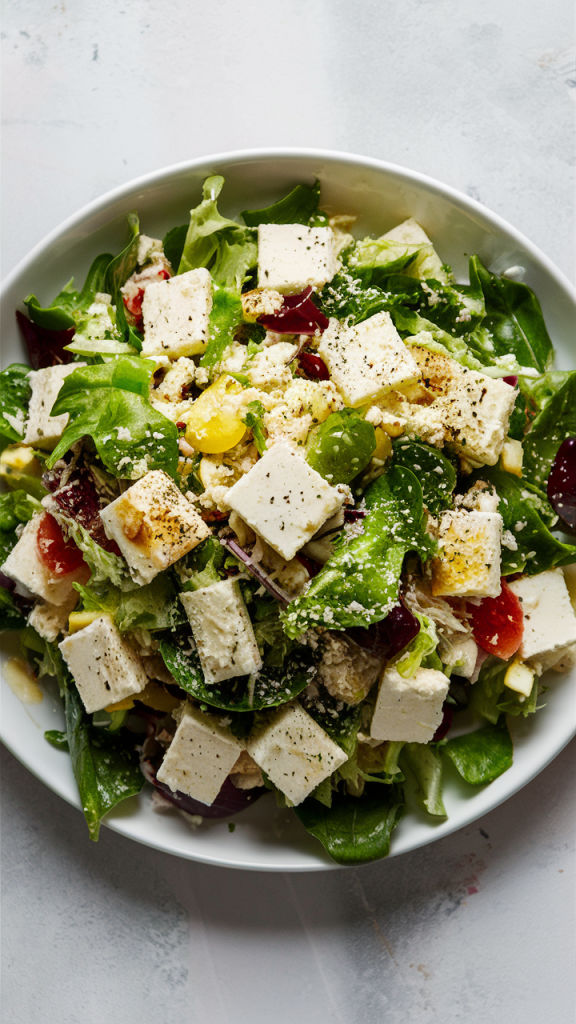 - Sirve: Vierte el aderezo de yogur sobre la ensalada y mezcla suavemente. Espolvorea con queso feta si lo deseas.