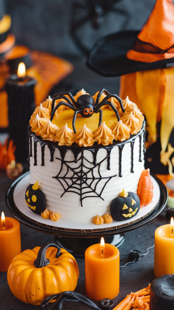 - Usa el chocolate blanco derretido para dibujar telarañas sobre la tarta.