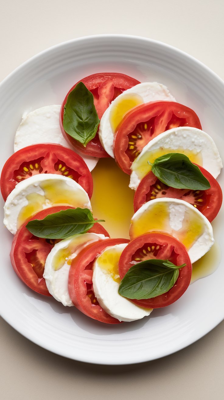 Alterna rodajas de tomate y mozzarella en un plato. Coloca las hojas de albahaca entre ellas.