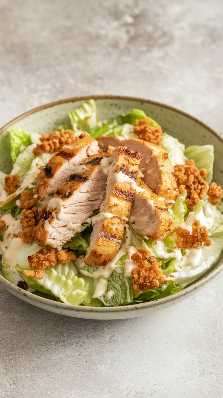 Mientras el pollo reposa, mezcla la lechuga romana con el aderezo César y los croutons keto. Corta el pollo en tiras y agrégalo encima. Finaliza con el queso parmesano rallado y un toque extra de pimienta negra recién molida. ¡Fresca, ligera y llena de sabor!