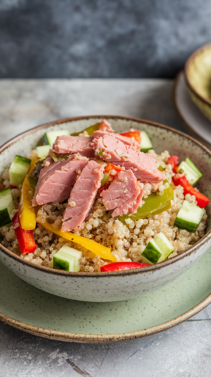 En un bowl, mezcla la quinoa con el atún desmenuzado. Agrega las rodajas de aguacate y espolvorea las semillas de sésamo.