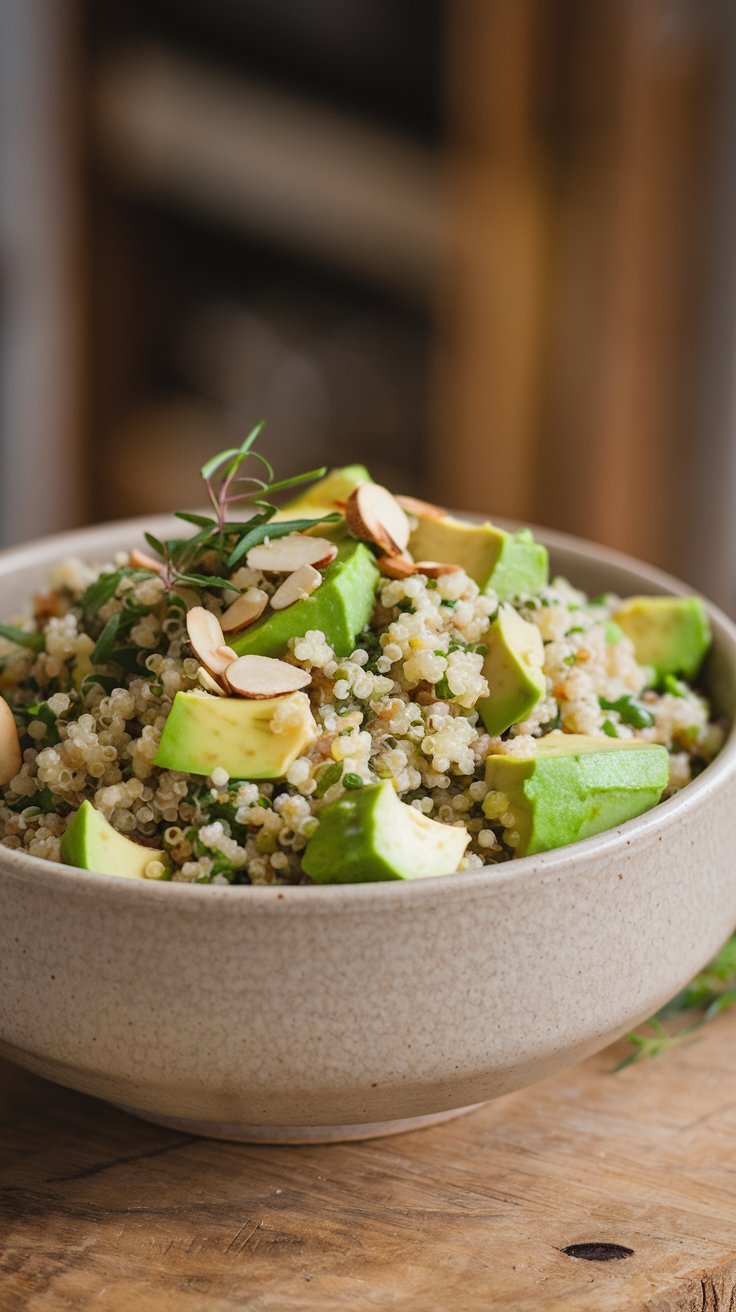En un bowl, mezcla la quinoa con el aguacate y las almendras.